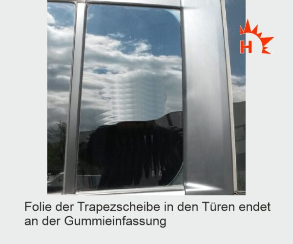 Achtung! Das Folienstück für die Trapezscheibe endet an der Gummieinfassung. Eine einfache Montage mit akzeptablen Ergebnis, sonst müsste die Tür zerlegt werden.